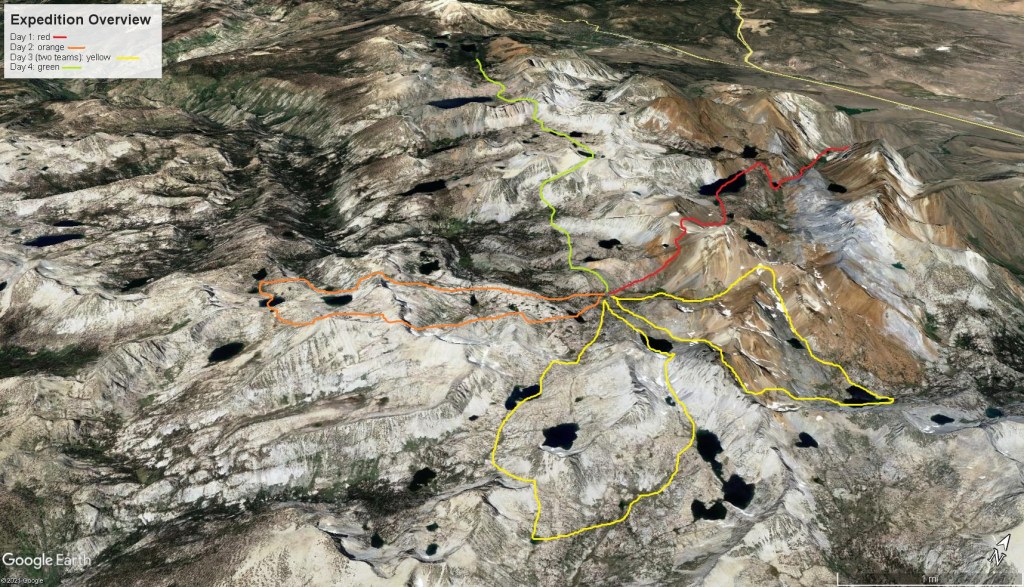 On day one, we will enter the John Muir Wilderness (Inyo National Forest) at Convict Lake; on day two will move west to Silver Pass; on day three, two teams of two will move south; on day four, we will reach the town of Mammoth Lakes, California.